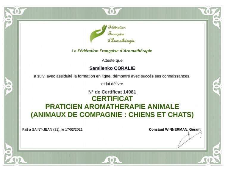 - Praticienne en aromathérapie animale, spécification : chiens, chats.